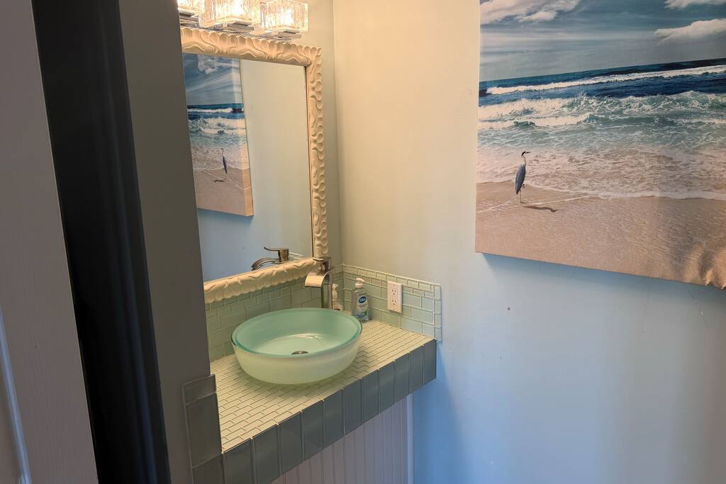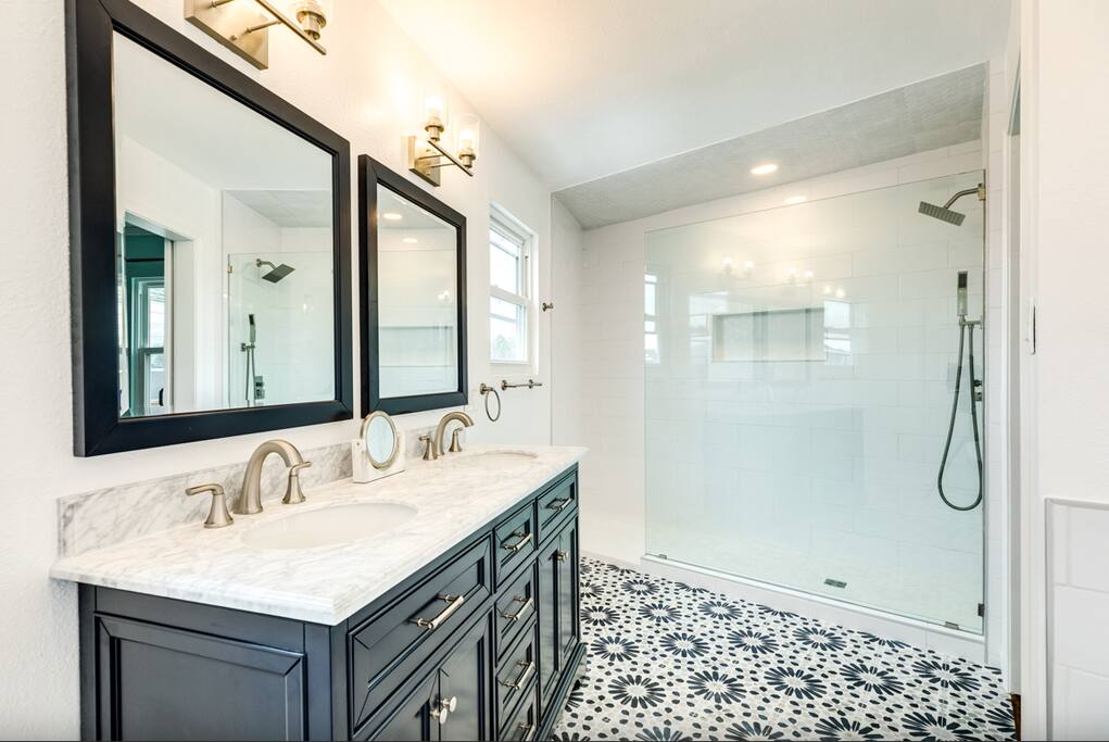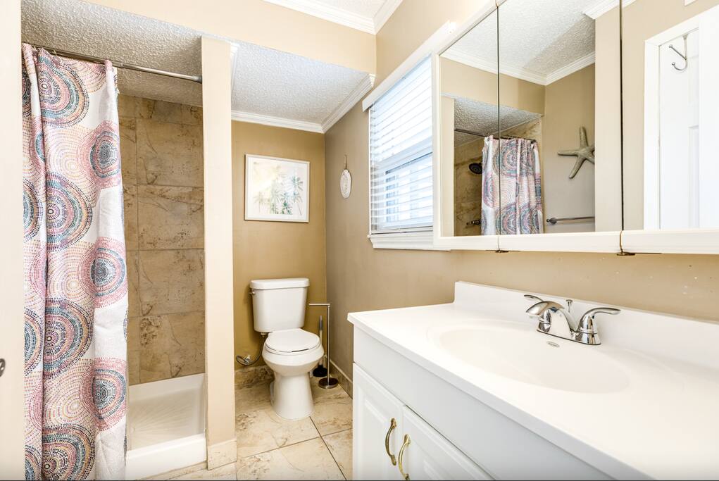 Upstairs main floor has 3 bedrooms, 3 bathrooms and a loft area. The master has a king and full bath with separate bath tub. The queen bedroom has a private bathroom with shower. The smaller twin room also has an extra fold out bed. There is a full bath by the kitchen. The loft above the kitchen has a queen and two twin bed. Downstairs by the pool there is a bonus room with a king bed with full bathroom with shower. The bathroom is accessible by the pool.